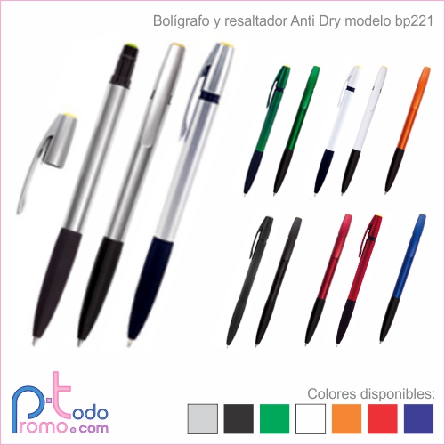 Pl?stico. Cuerpo de color metalizado con acabado mate. Mecanismo giratorio. Resaltador anti dry en barra (no se seca). Grip de goma. Tinta negra. Colores disponibles: negro, blanco, plateado, azul, azul royal, rojo.